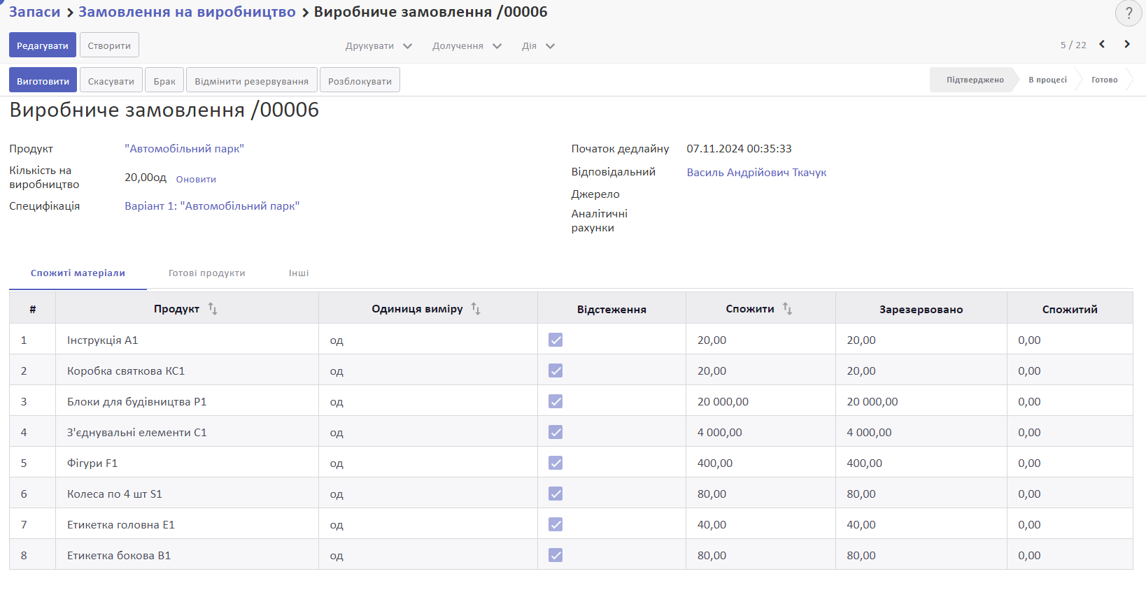 Ви побачите виробничі замовлення у статусі Підтверджено та В процесі, а також дані по них: