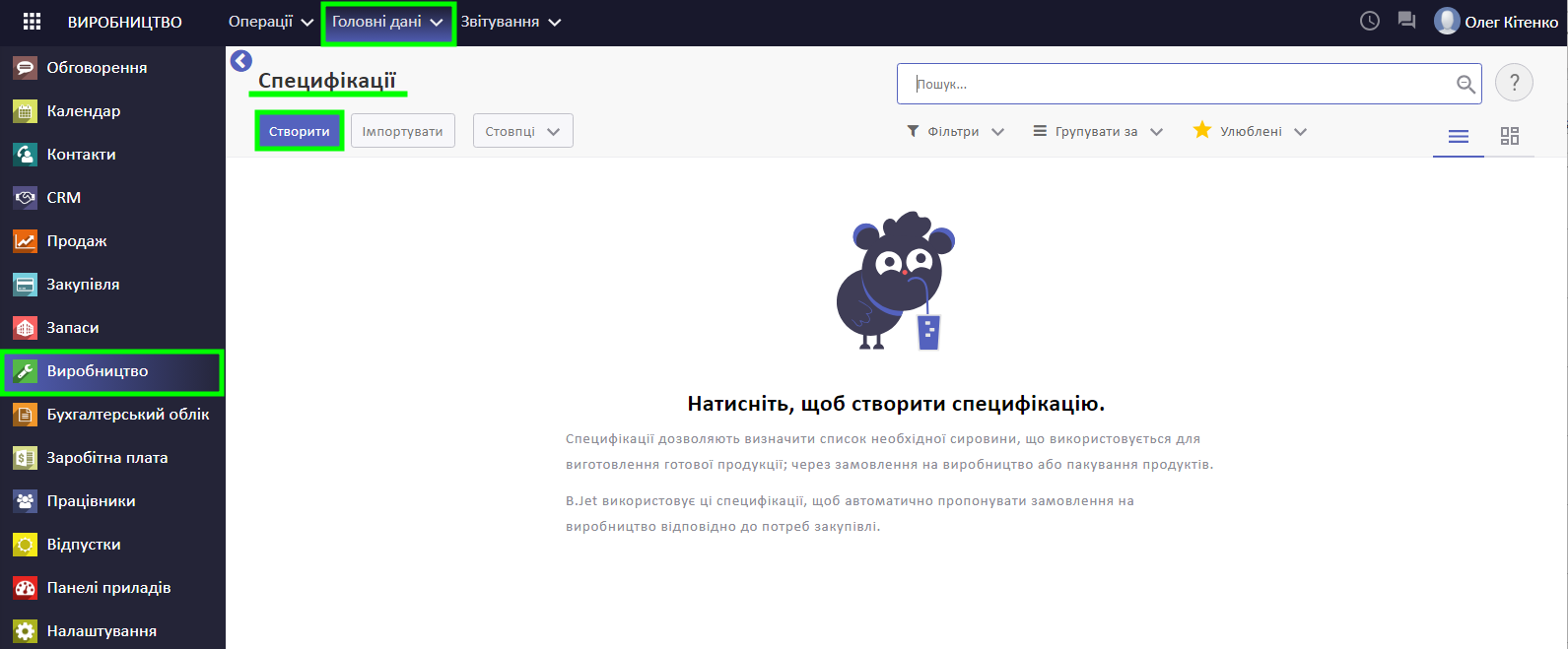 Щоб створити нову специфікацію, перейдіть до меню Виробництво > Головні дані > Специфікації та натисніть Створити.