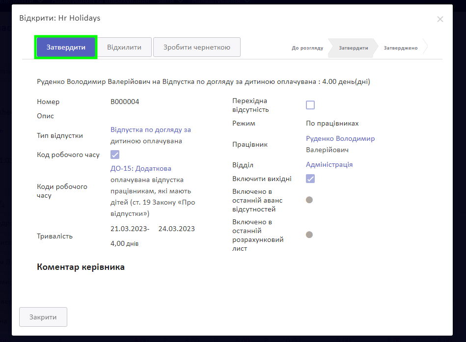 - У новому вікні перегляньте дані відпустки та натисніть Затвердити.